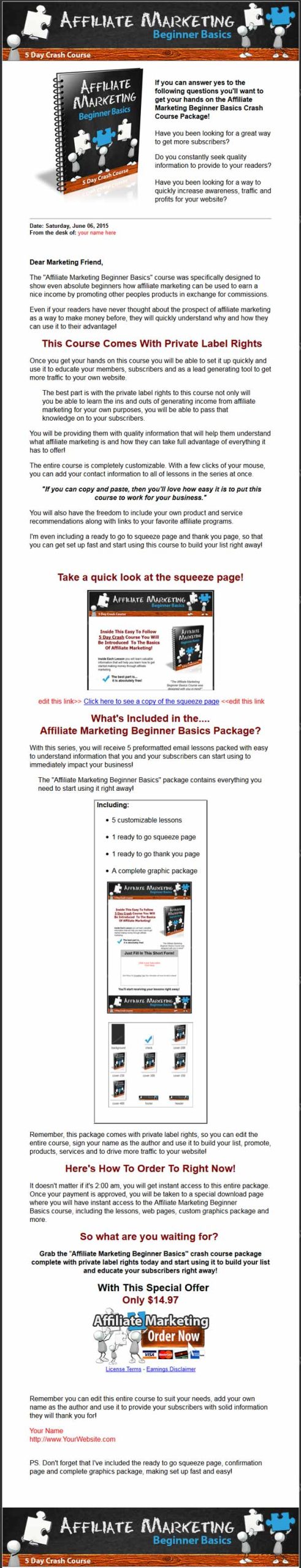 The “Affiliate Marketing Beginner Basics” course was specifically designed to show even absolute beginners how affiliate marketing can be used to earn a nice income by promoting other peoples products in exchange for commissions.