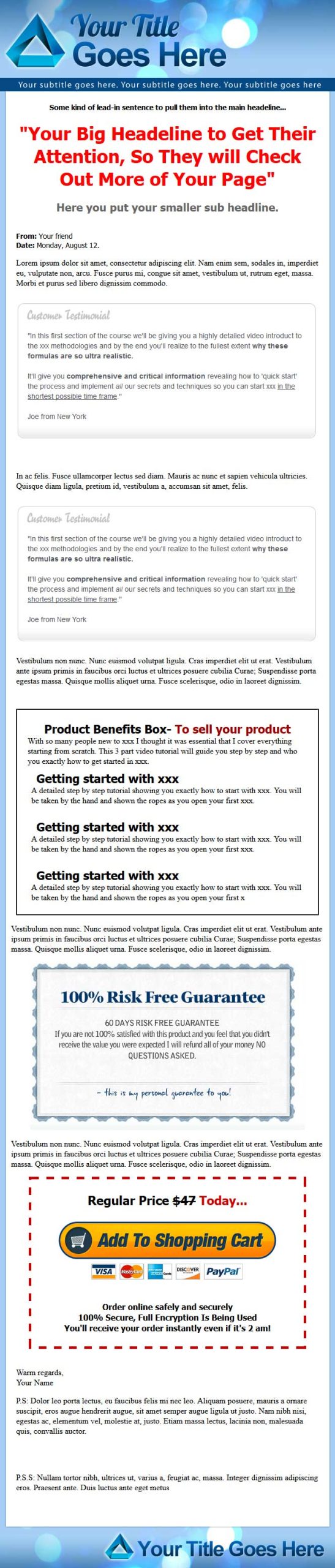- Sales page – Selling your own product? Want to sell your own product? Then you need this template. It comes with all the sales elements already built into the template including, testimonial boxes, guarantee graphic and a pro buy now button image. Just add your sales copy, and your ready to sell.