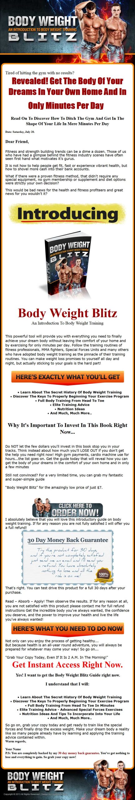 Body Weight Blitz Ebook comes in the ever popular Adobe PDF, so you know it will work for all your customers. There are no outside links in the book.