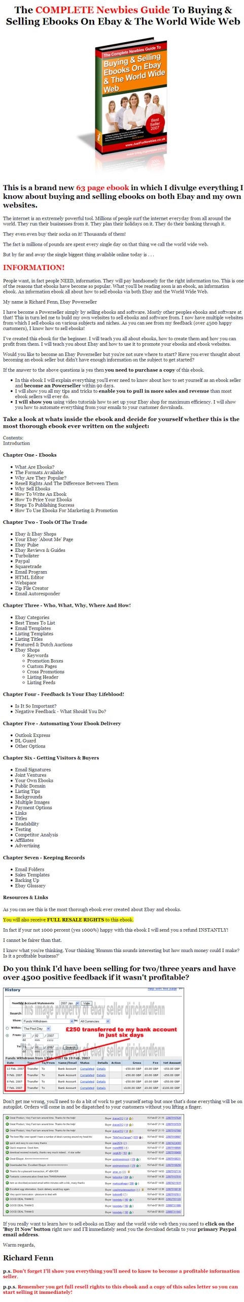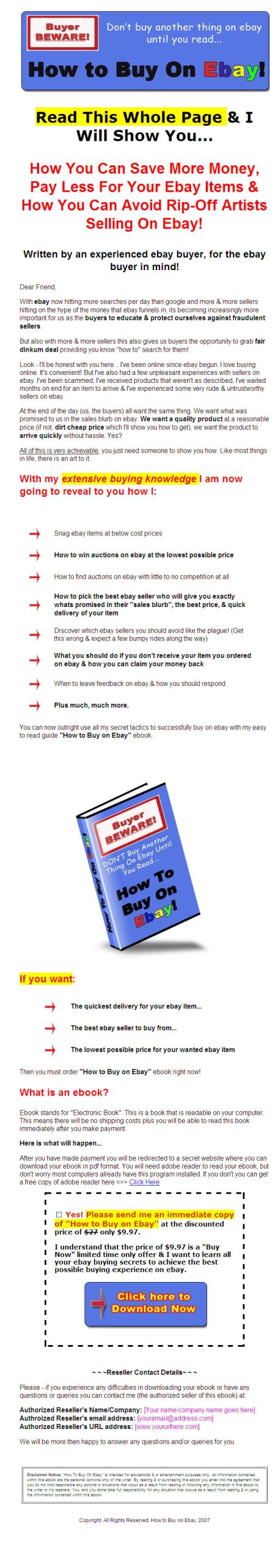Explains: Tools of the trade, Ebay Shops, Ebay Pulse, About me pages, Reviews and Guides, PayPal, Squaretrade, Best times to list, Listing Titles, Featured and Dutch Auctions, Joint Ventures and much more.