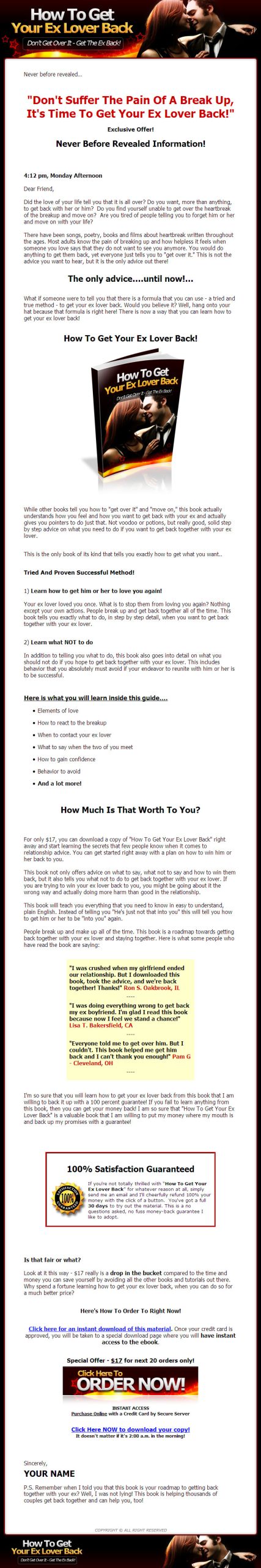 What if someone were to tell you that there is a formula that you can use – a tried and true method – to get your ex lover back. Would you believe it? Well, hang onto your hat because that formula is right here! There is now a way that you can learn how to get your ex lover back!