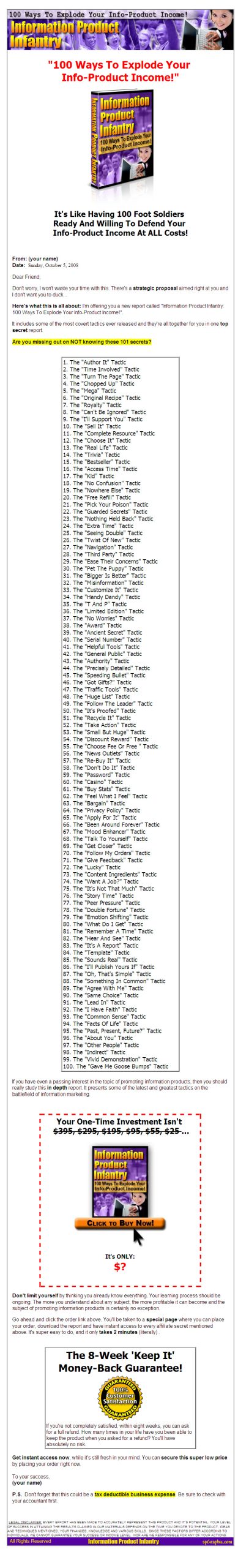 Here’s what this is all about: I’m offering you a new report called “Information Product Infantry: 100 Ways To Explode Your Info-Product Income!”.