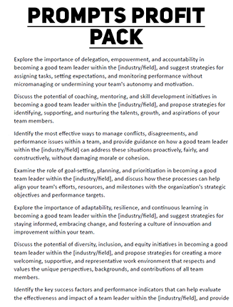 This great AI prompts pack comes with over 40 total reports divided into seven different categories. Each report contains at least 15 prompts to over 100. Easy copy and paste content in both PDF and Microsoft Word DOC formats for ease of use and editing. Add your own, add your business info, do what you’d like! Each category is neatly organized in its own folder with its corresponding reports, making it super simple to break them down into individual files to sell for even more profit and multiple passive income streams! There are over 2500 prompts in total! The categories and number of prompts are: