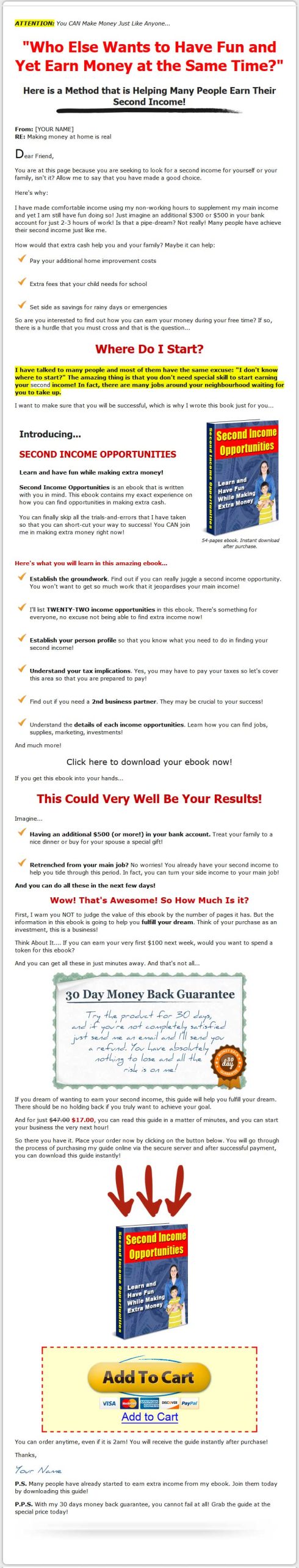 Second Income Opportunities is an ebook that is written with you in mind. This ebook contains my exact experience on how you can find opportunities in making extra cash.