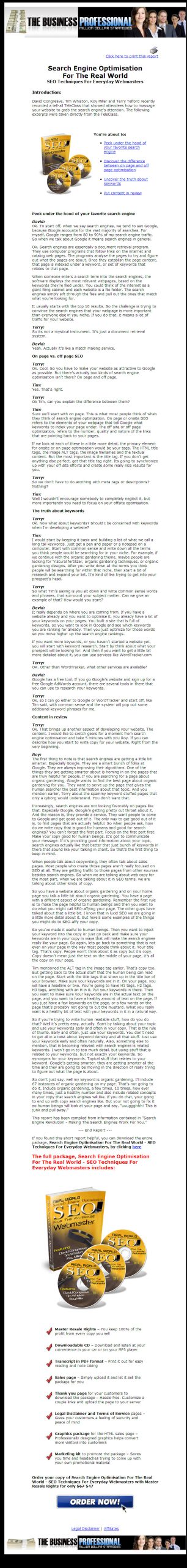 The full package, Search Engine Optimisation For The Real World – SEO Techniques For Everyday Webmasters includes: