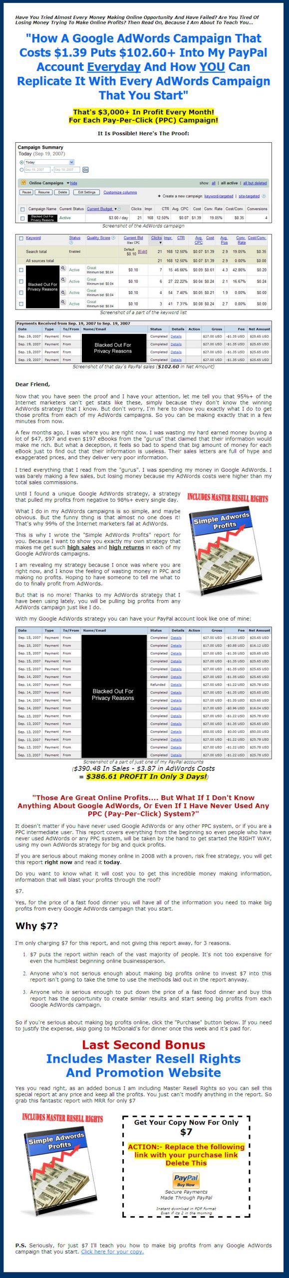 "How A Google AdWords Campaign That Costs $1.39 Puts $102.60+ Into My PayPal Account Everyday And How YOU Can Replicate It With Every AdWords Campaign That You Start"
