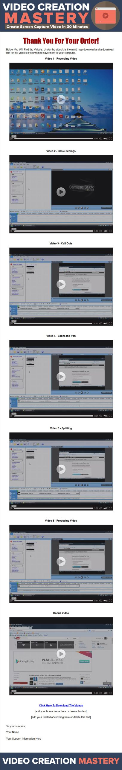 The Video Creation Mastery video series answers the questions and walks the viewer through every step in the creation process.
