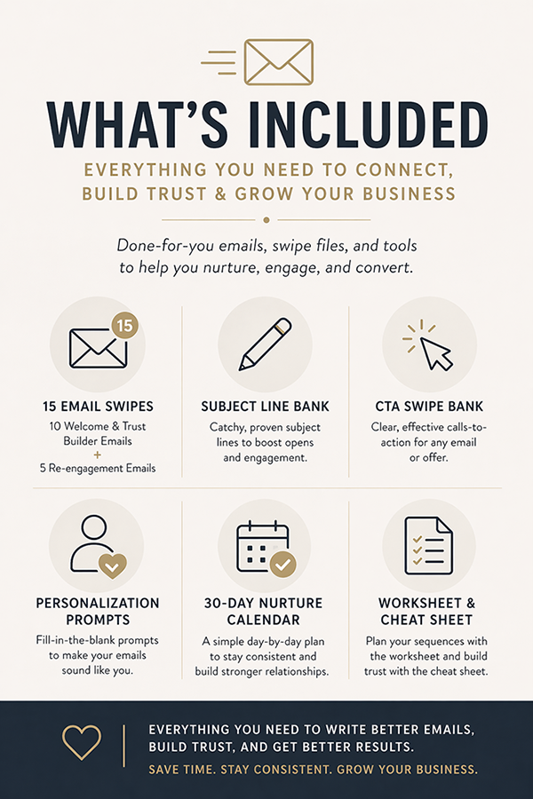Bonus Resources: Subject Line Bank, CTA Swipe Bank, Personalization Prompts, 30-Day Nurture Calendar, Sequence Builder Worksheet, Trust Trigger Cheat Sheet