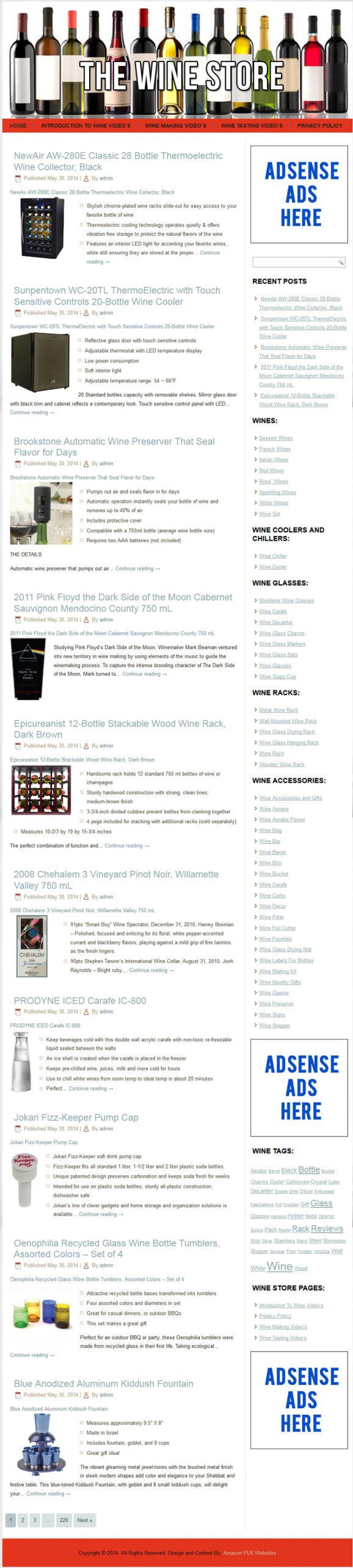 - Amazon Wine Products – Fully stocked store with over 2,100 Wine products already put into the site. Each product has it’s own page. The full description from Amazon is also included in the page. This gives your site many pages and many opportunities to make you money.
